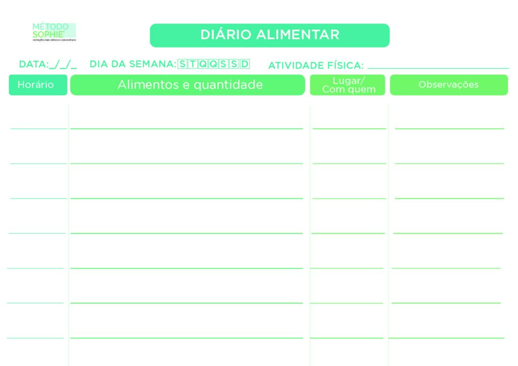 Abaixo está um diário alimentar simples que pode servir de modelo para você.